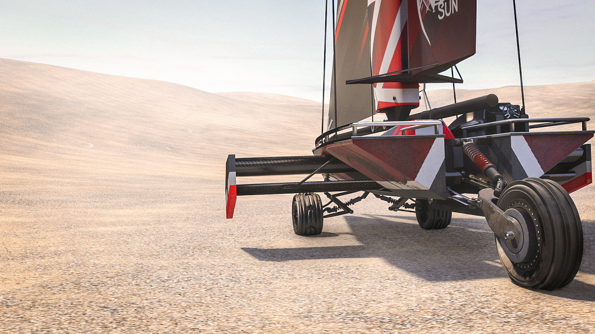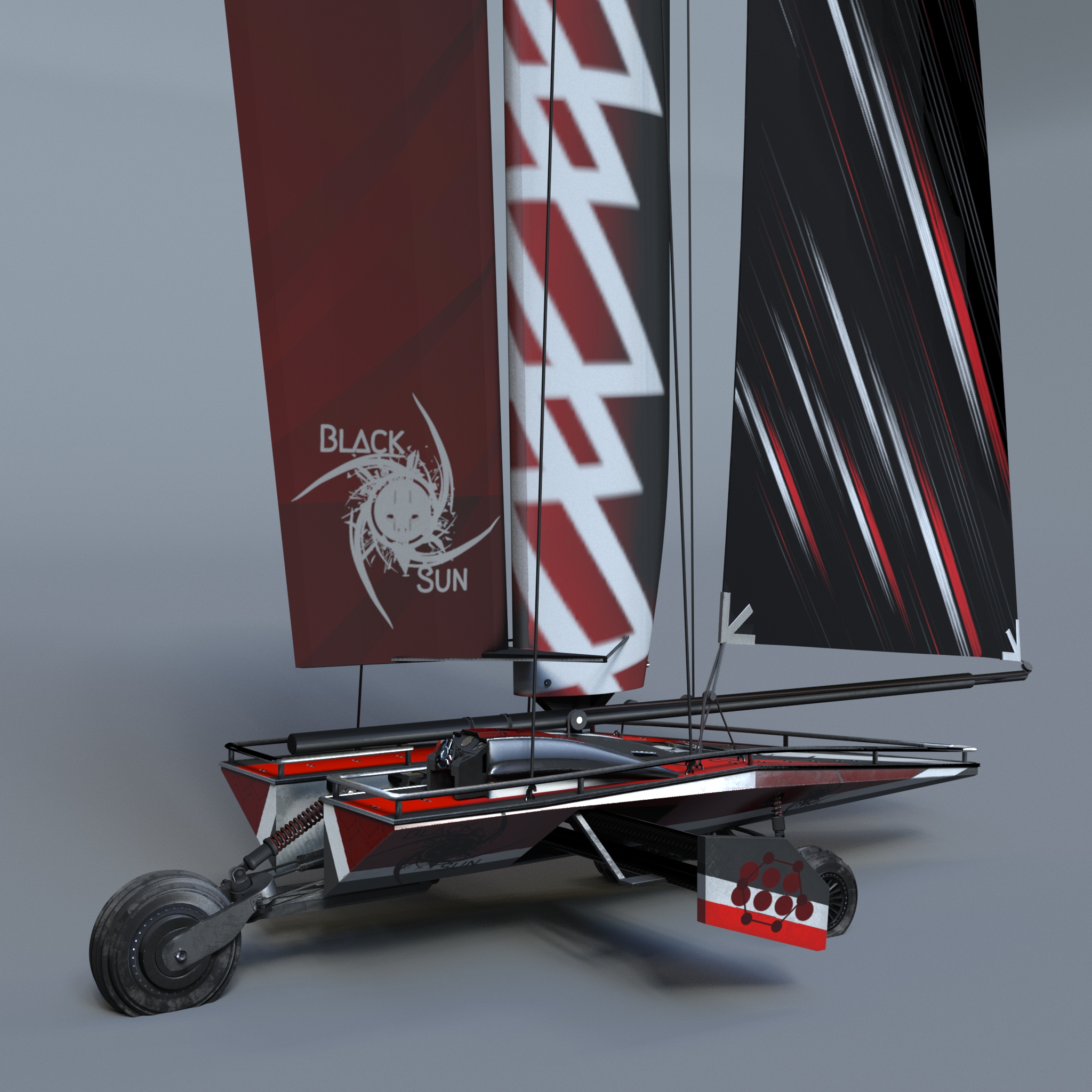 The sand runner is a sail powered car used in the sandy desert dunes. It uses a wing sail to generate it's momentum and uses it's resultant force to generate lift and prevent the craft from flipping over. It also makes use of an inverse airfoil wing to generate downforce which aids in its stability. At the front is two wheels with a custom designed di-axial pushrod suspension for lateral and vertical shock absorption. The rear wheel, along with the articulating wing sail, are used to steer. It is designed to be piloted by a single occupant but can hold up to ten on its top deck.