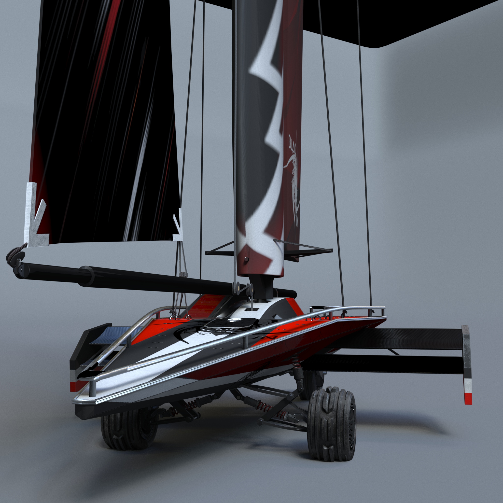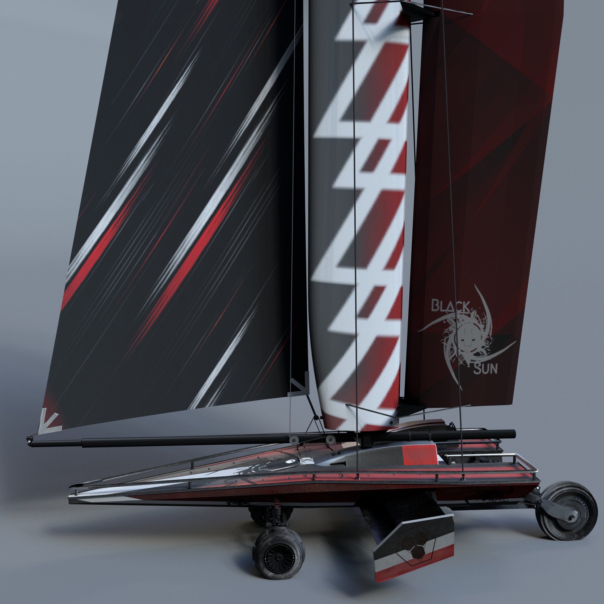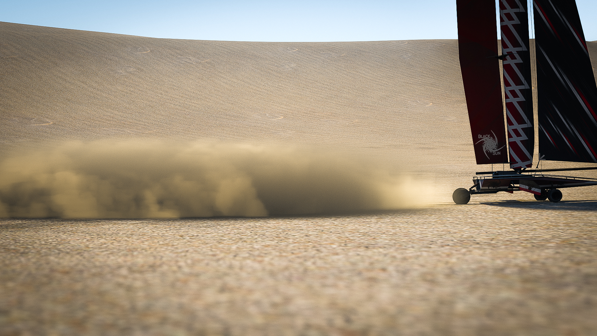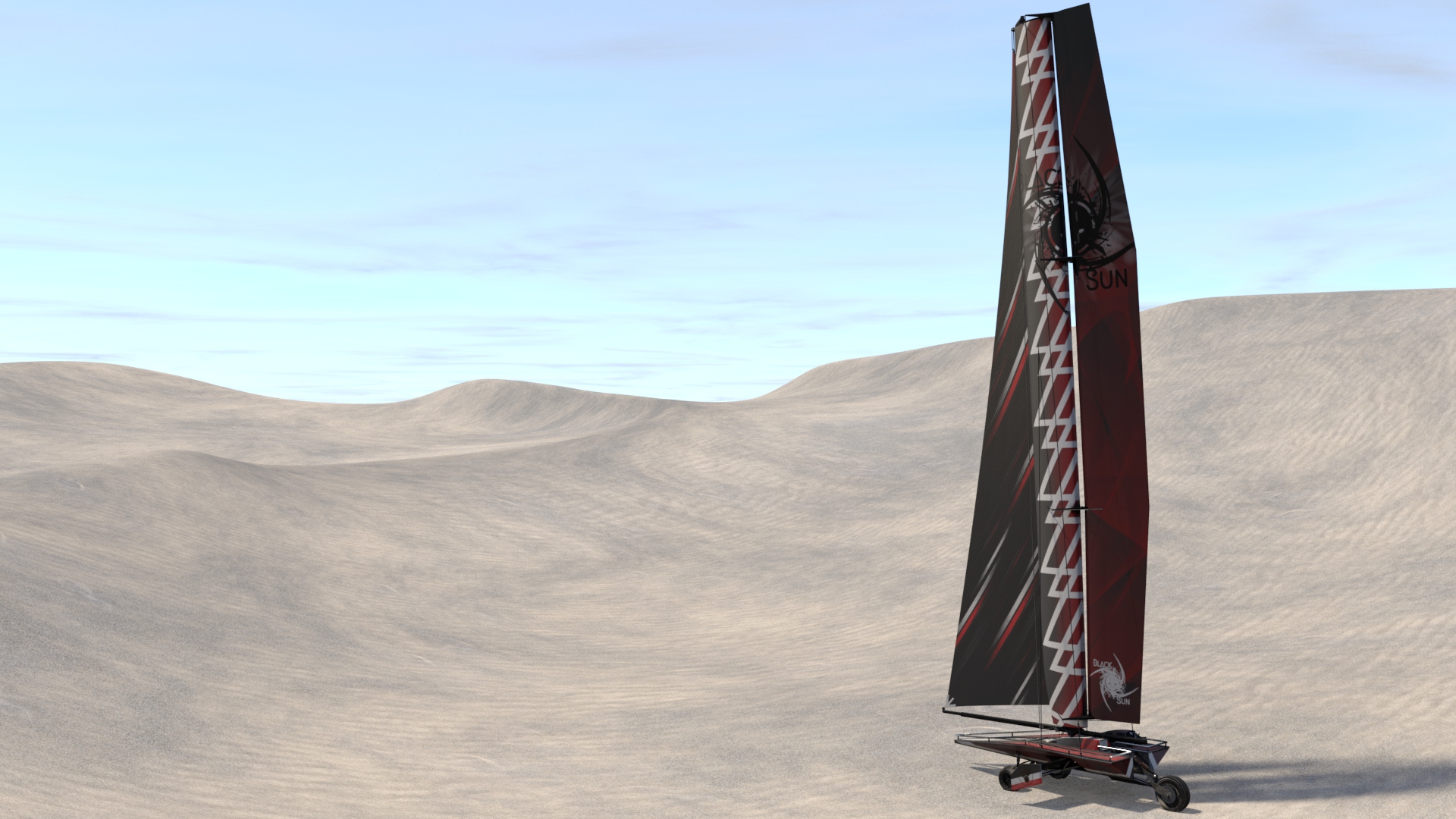 The sand runner is a sail powered car used in the sandy desert dunes. It uses a wing sail to generate it's momentum and uses it's resultant force to generate lift and prevent the craft from flipping over. It also makes use of an inverse airfoil wing to generate downforce which aids in its stability. At the front is two wheels with a custom designed di-axial pushrod suspension for lateral and vertical shock absorption. The rear wheel, along with the articulating wing sail, are used to steer. It is designed to be piloted by a single occupant but can hold up to ten on its top deck.